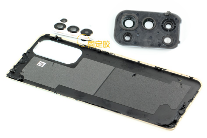 OPPO Reno 5玻璃后盖上的后置摄像头防护盖,通过胶与后盖固定。可以看到与镜头接触部分,都带有防震泡棉。