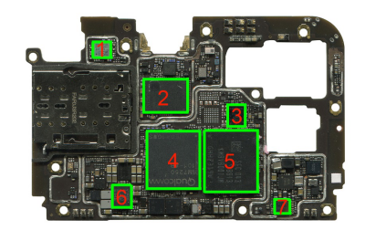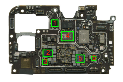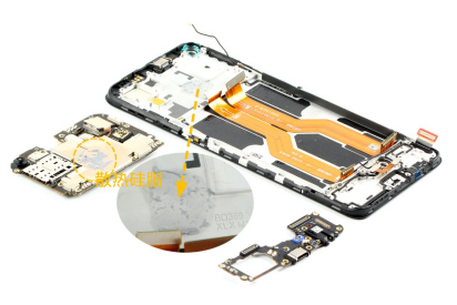 断开OPPO Reno 5主副板之间各个连接器,取下主副板,主要芯片的屏蔽罩位置与内支撑之间涂有灰色导热硅脂,主板反面的屏蔽罩表面也贴有大面积散热铜箔。