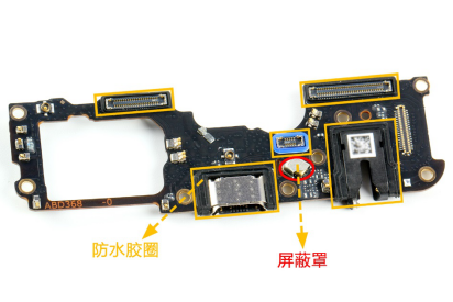 OPPO Reno 5副板各接口都配有硅胶套,其中连接指纹模块的BTB连接器使用了蓝色硅胶套。麦克风表面配有屏蔽罩。