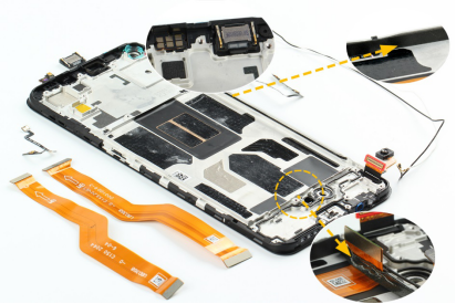取下OPPO Reno 5的主板后,中框上的各个小部件都可以取下了。两根同轴线被泡棉胶条固定在内支撑右侧的凹槽内。顶部听筒和光线距离传感器小板也通过泡棉胶固定在各自安装位内。屏下光学指纹识别器也通过泡棉胶贴合固定在内支撑底部。两侧的按键软板通过双面胶贴合固定。主板与副板通过两根FPC软板连接,软板使用黑色双面胶固定在中框上,底部折弯处还带有泡棉胶条保护。