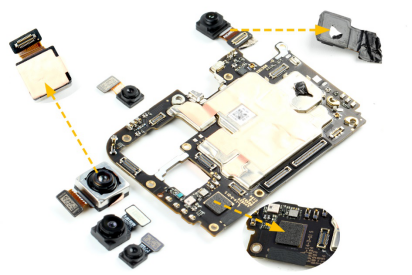 OPPO Reno 5的主板上共五颗摄像头,都为单独模组,每颗摄像头也都有不同的防护。200万像素微距摄像头有主板之间有泡棉胶垫,3200万像素前置摄像头背面有石墨贴纸,6400万像素后置主摄像头背面贴有散热铜箔。