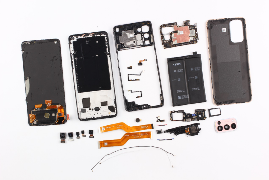 OPPO Reno 5的整体拆解还算简单,使用的是安卓机常用的三段式组装。OPPO Reno 5相比上一代增加了280 mAh电池容量,但机身更为轻薄,机身厚度为7.9mm,极光蓝、月夜黑配色机身重量约为172g,星河入梦配色约为180g。