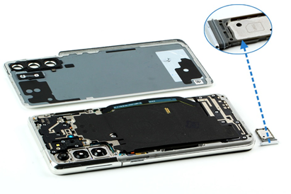 将三星Galaxy S21关机,取出卡托,SIM卡托采用胶圈防水,卡托上有卡扣来固定安放SIM卡。该机为塑料后盖,盖所用胶的粘性并不强。通过热风抢加热后,利用撬片将后盖打开。