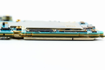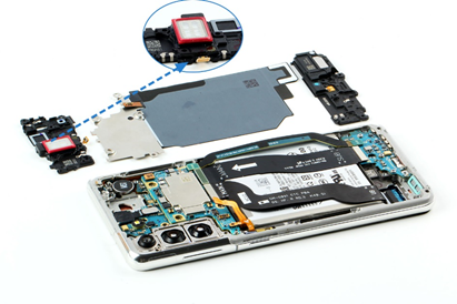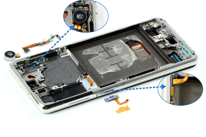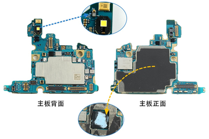 再取下三根FPC排线,取下主板、顶部天线模块、副板以及前后置摄像头。其中主副板、天线模块和后置摄像头都采用螺丝固定。在拆解时要多加注意前置摄像头周围涂有一圈胶,较难取下。