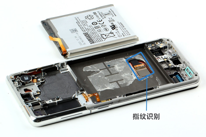三星Galaxy S21的指纹识别通过胶固定在屏幕背面,较难取下。三星 S21采用高通的超薄超声波指纹识别模块,而国产旗舰机主流采用的方案则是汇顶科技的屏下超薄光学指纹。