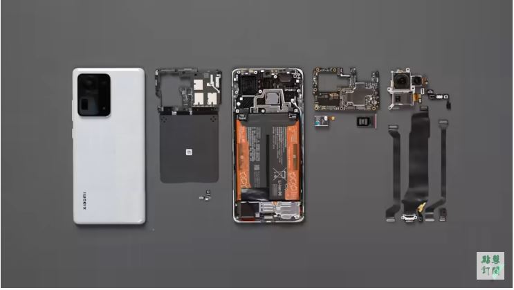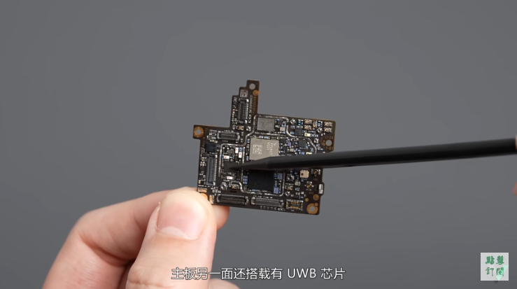 主板采取还是常见三段式结构,上方主要是SoC、摄像头CMOS、内存闪存、UWB天线等;中间部分是NFC/无线充电线圈,双电芯电池;下方则是集成扬声器、线性马达、USB等模块的副板。