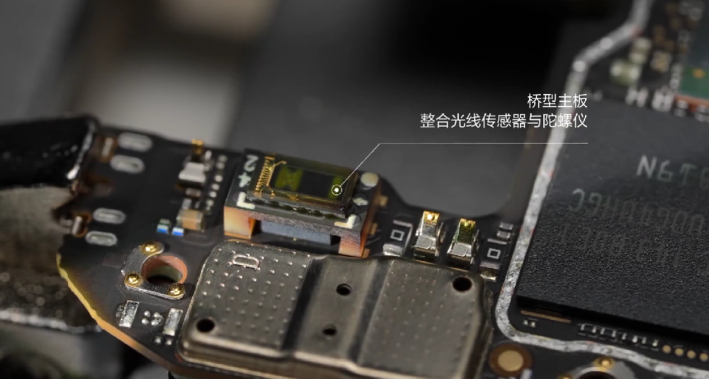 打开盖板,是各种密密麻麻的元器件,其中包含01005小封装器件、桥型主板整合光线传感器和陀螺仪。