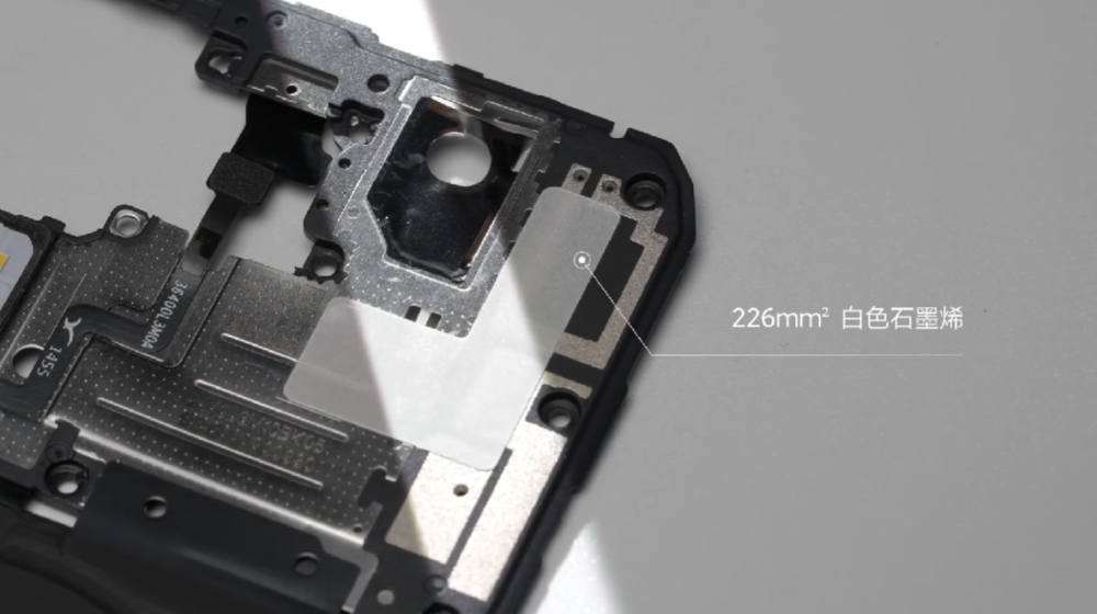 接着便是散热材料,盖板拥有226mm 白色石墨烯,即六方氮化硼,是一种低介电的高导热材料。由于其结构与石墨非常相似,具有六方层状结构,常用于航天领域。