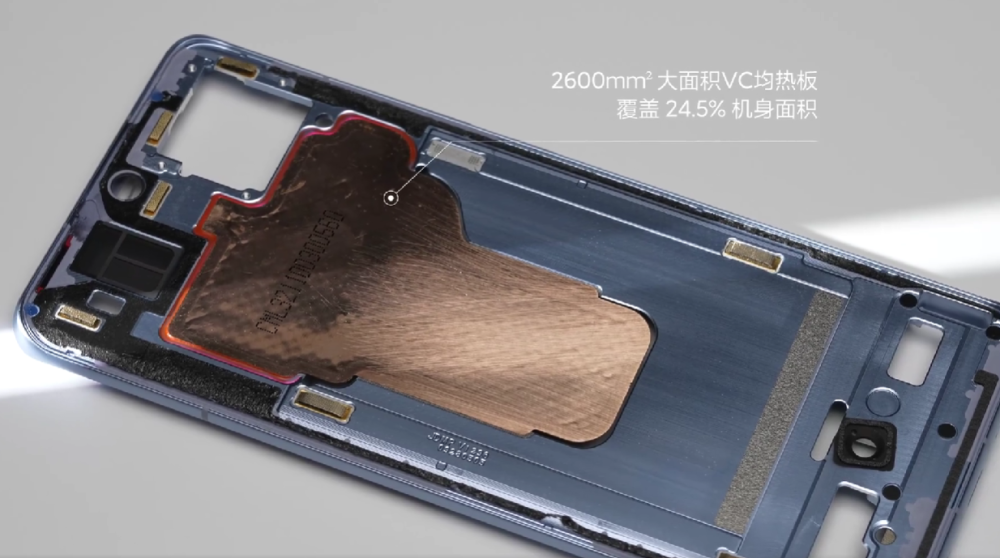 盖板还有着大面积散热石墨,几乎覆盖了整个机身,撕开之后是2600mm 大面积VC均热板,覆盖24.5%机身面积。
