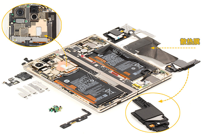 紧接着来看看主板,主板上的BTB接口都通过金属盖板固定,主板盖板被拆分成多个小盖板进行固定,这样可以使得机身更轻薄。NFC线圈上贴有大面积散热膜一直覆盖到电池位置。取下双扬声器时,也发现对比其他手机的扬声器,MIX Fold2底更薄。