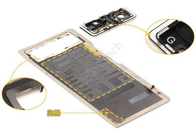 后盖上贴有大面积泡棉,泡棉下有石墨烯散热膜。后盖对应摄像头盖板位置贴有金属片,与摄像头盖板通过点焊固定并贴有泡棉胶固定。