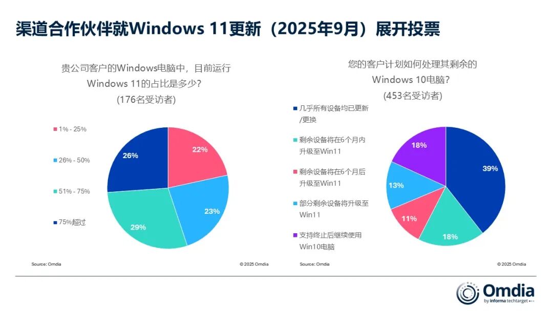 最新的PC渠道合作伙伴调查显示,在将B2B客户过渡到Windows 11方面仍有大量工作要做。根据2025年9月的一项调查,在453名受访者中,仅有39%表示他们客户的PC几乎全部完成了更新或升级。另有相当比例的18%受访者表示,他们的客户计划在支持终止后继续使用Windows 10,其中许多人可能会选择微软提供的扩展安全更新(Extended Security Updates)选项。对于微软及其OEM和渠道合作伙伴而言,这意味着仍有一大批用户需要持续的宣传引导与过渡支持。